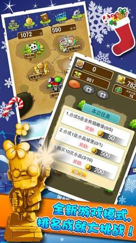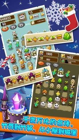 1. 创新合成玩法:游戏的核心玩法是物品合成,玩家需要将三个或更多相同的物品连在一起进行合成,生成更高级的物品,如竹芽合成竹笋,小屋合成城堡等。